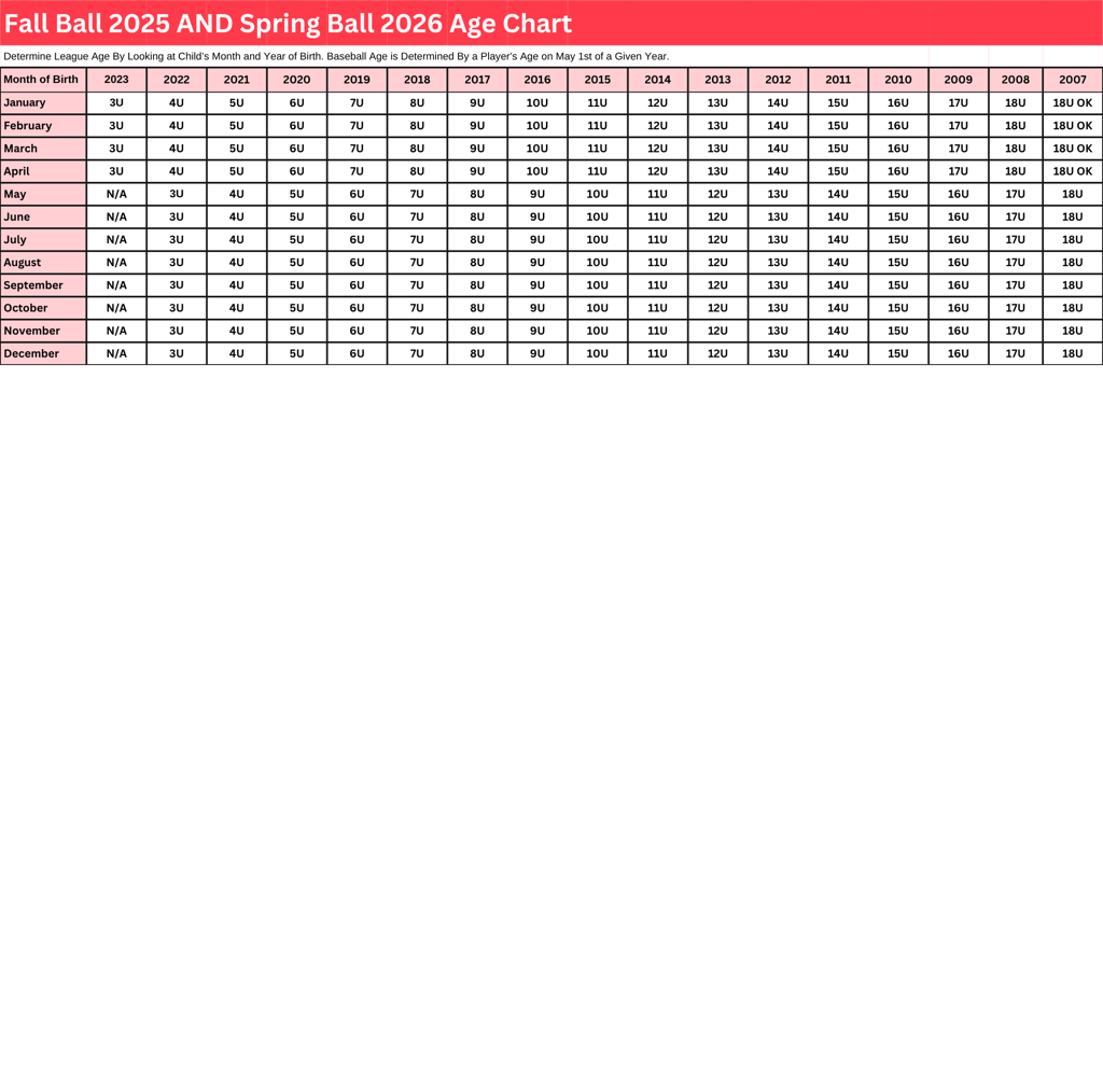 *For fall ball, your child will play their spring 2026 age! This means if your child recently played 7U during spring 2025, they would move to 8U for fall 2025 and spring 2026.